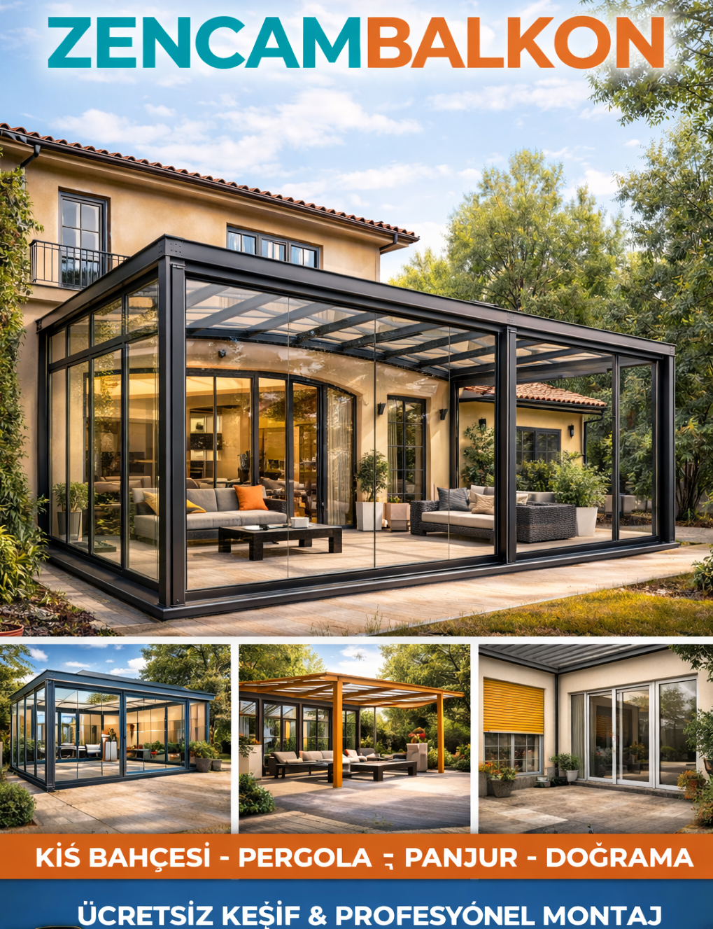 Çatı ve pergola tasarlandı ve kurulumu tamamlandı artık etraf kapatma sistemine karar verilecek. Kullanım amacına bağlı bir çok ürün tercih edilebilir. Cam balkon ürünleri estetik ve kullanım rahatlığı ile ön plana çıkmaktadır. Temperli camlar normal camdan 6 kat daha dayanıklı hale getirilmiştir. Füme, bronz, mavi ve yeşil cam seçenekleri kullanıma sunulmuştur.
